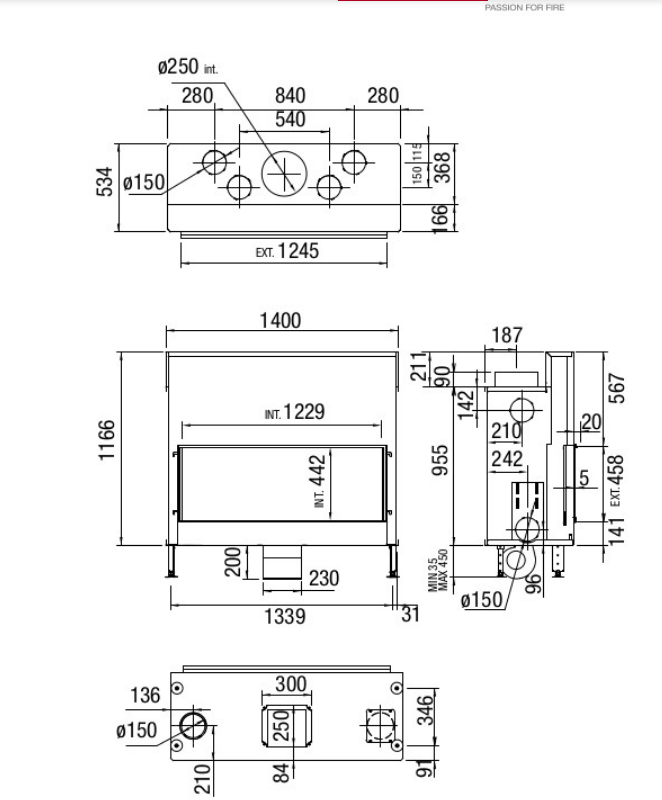 Nos encontramos delante de una chimenea cerrada a leña con hogar vermeculita y opcionalmente en acero negro o de fundición con base en vermeculita. Dispone de un exclusivo sistema de apertura vertical con cristal al aire y para facilitar las operaciones de limpieza del cristal, la puerta se puede abrir de forma batiente.