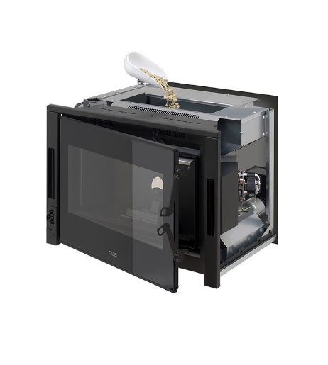 Zefiro3 es un insertable de pellet de 9 kW, ideal para aprovechar chimeneas que no se utilizan ya que se integra perfectamente. Dispone de un kit de canalización opcional de aire hasta 6 metros.