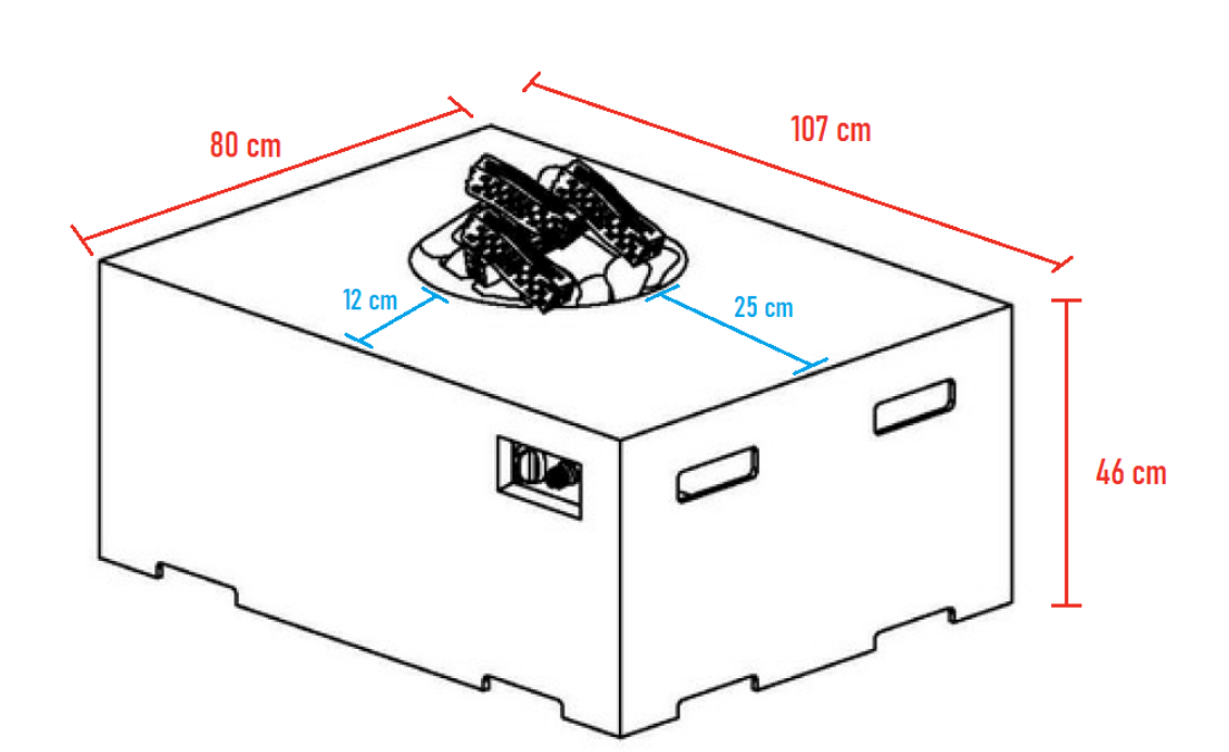 Realizada en composite, encendido y regulación manual, incluye efecto y funda. No incluye set de cristales ni soportes para mesa