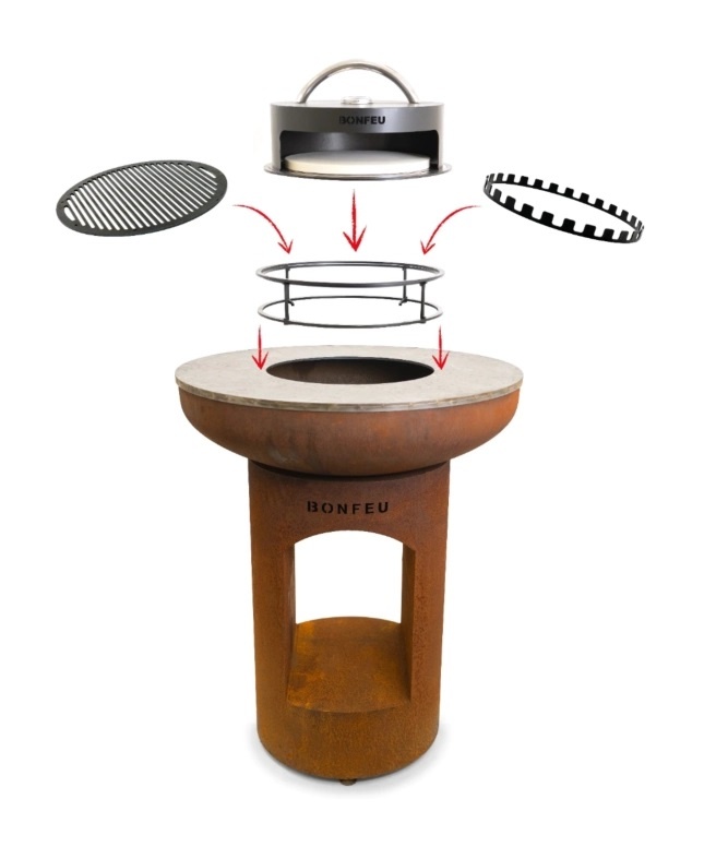 Para que cocinar en BonBiza sea aún más fácil, divertido y variado, se han desarrollado varios accesorios. Estos accesorios están hechos especialmente para BonBiza y, por lo tanto, realmente optimizan su capacidad de cocinar con el producto. Hay 3 nuevas opciones de cocción con los accesorios: hornear pizza con el horno BonPizza, hacer brochetas con el Aro para Brochetas BonFeu y asar a la parrilla con el Grill for Stand.