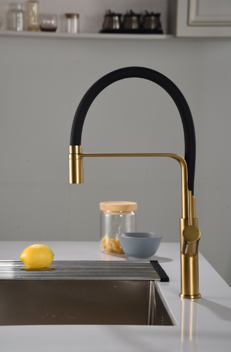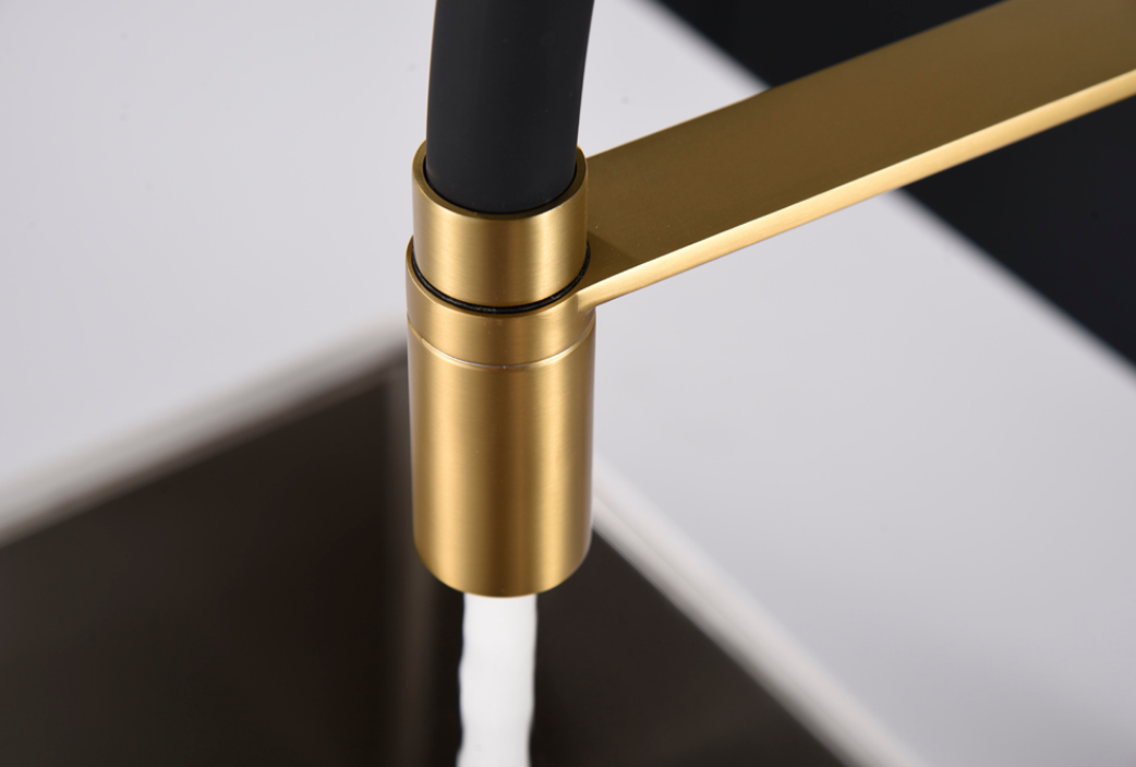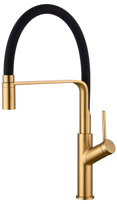 Cuerpo de grifería en latón oro cepillado y caño flexible negro mate.